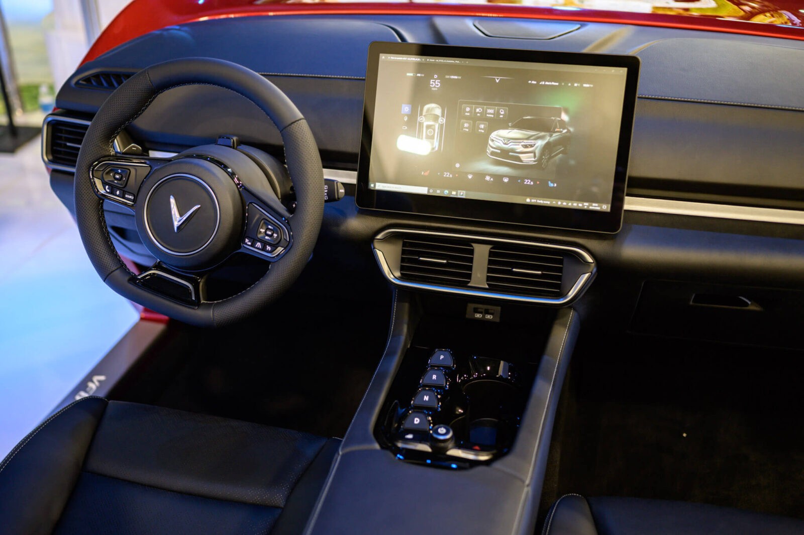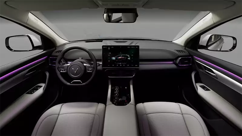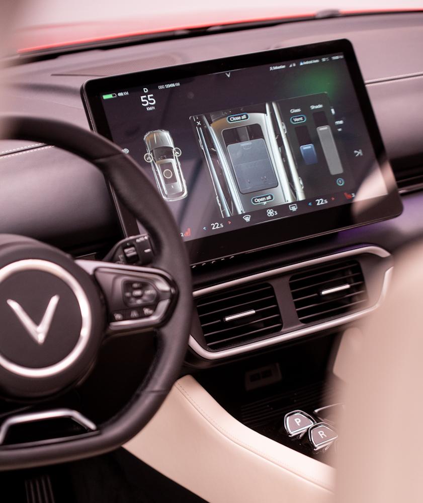 Cần số dạng nút bấm. Bệ tỳ tay kích thước lớn có thể trở thành bàn làm việc khi cần. Hệ thống đèn viền nội thất không chỉ mang đến cảm giác dễ chịu cho người ngồi, mà còn tăng thêm tính sang trọng cho mẫu xe điện nguồn gốc Việt Nam.